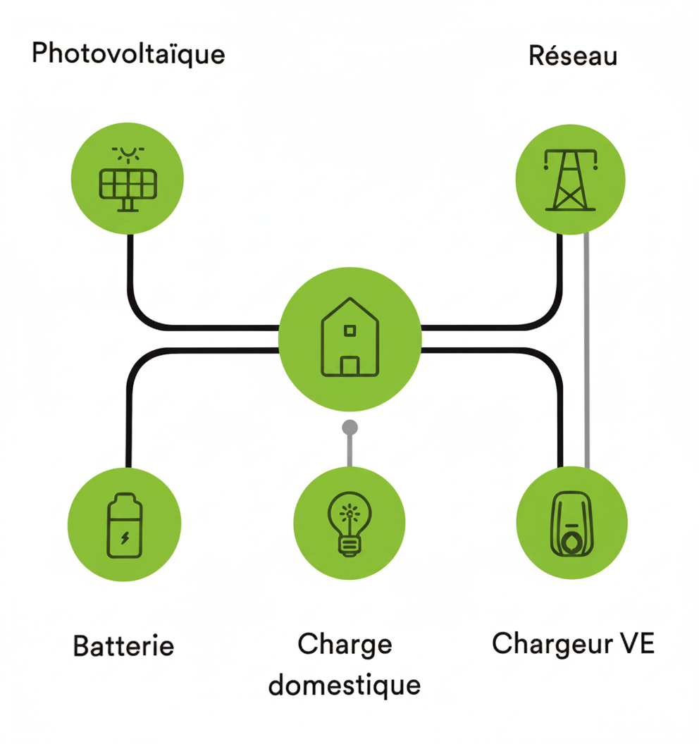 Lorsque votre production est supérieure à votre consommation, le surplus d’électricité est injecté sur le réseau. À l’inverse, quand vos panneaux ne produisent pas assez d’énergie pour couvrir vos besoins (la nuit ou par temps très couvert), vous continuez à être alimenté par le réseau électrique classique.